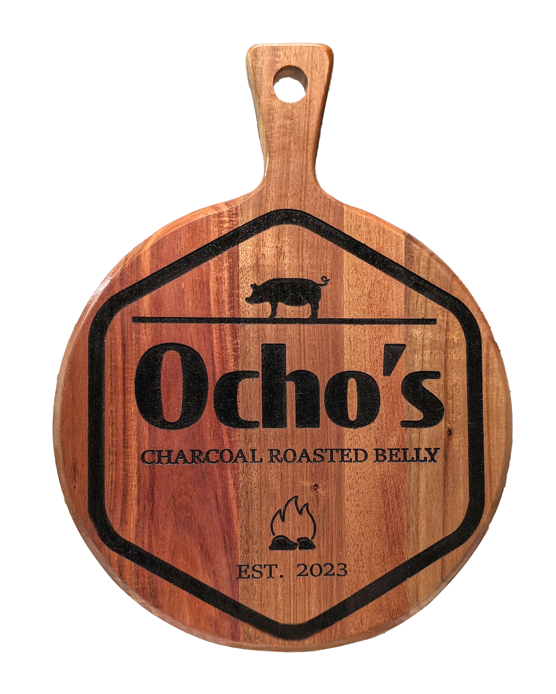 This wooden, round, paddle-cutting board can be customized with your name and graphics. We will work together to create a design that suits your taste.